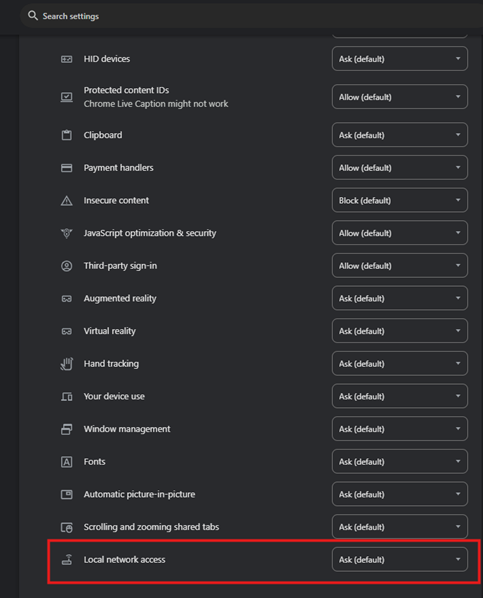 - In the dropdown menu, look for Local Network Access or Allow access to local network.